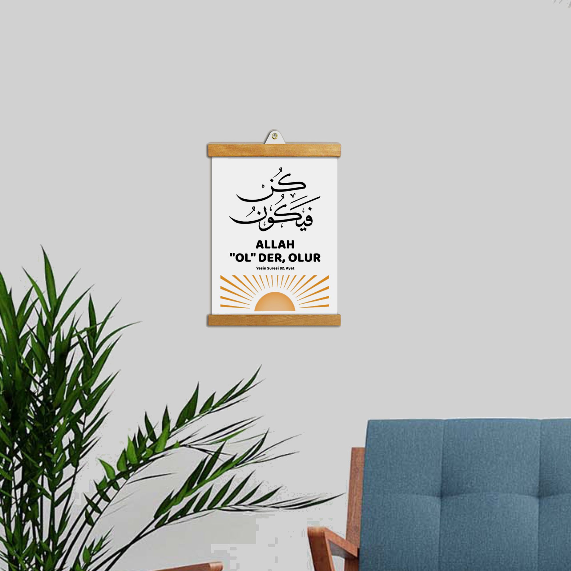 “Allah Ol Der Olur” yazılı bu tablo; tevekkül, sabır ve teslimiyet duygusunu mekâna taşıyan sade bir tasarıma sahiptir.