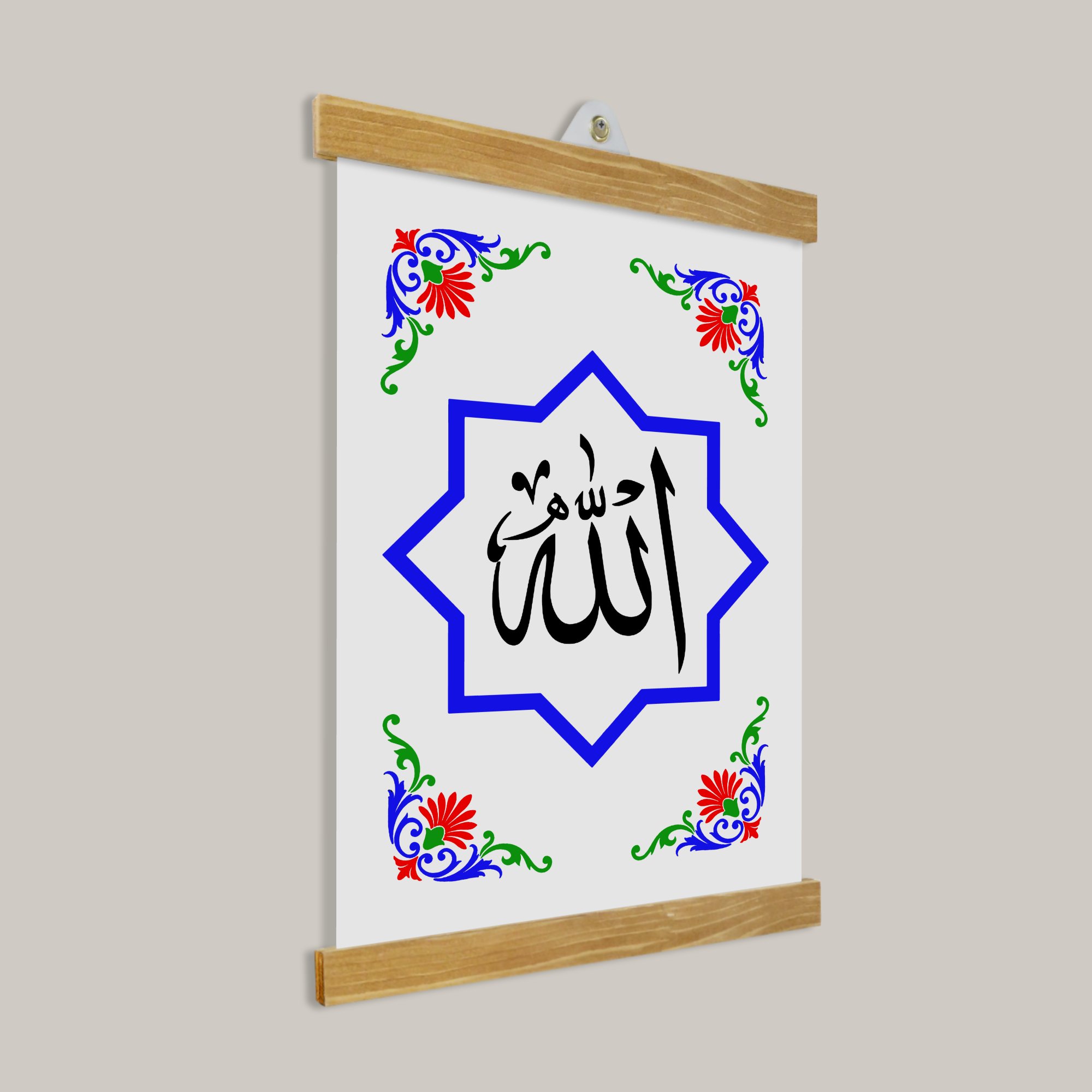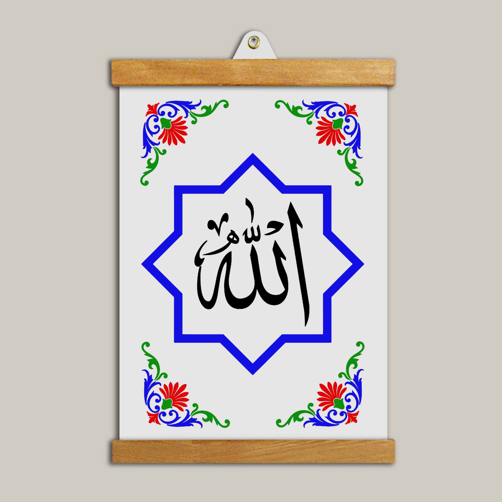 Bu özel tablo, İslam sanatında derin anlamlar taşıyan Arapça Allah lafzını, çevresini saran mavi yıldız ve çizgi detayları ile birlikte sunar.