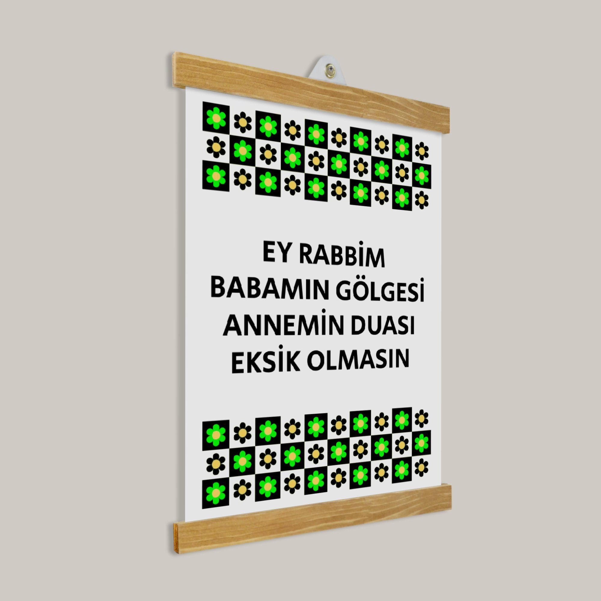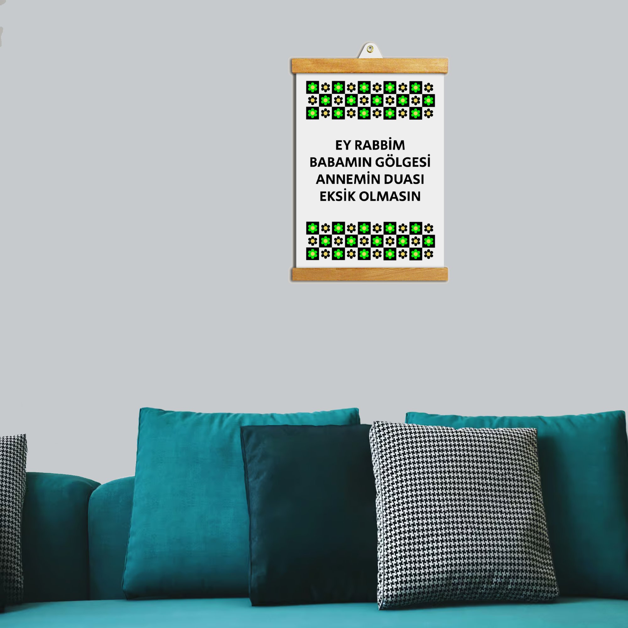 “Babamın Gölgesi Annemin Duası” yazılı bu tablo; baba ve anne sevgisini mekâna taşıyan sade bir tasarıma sahiptir.