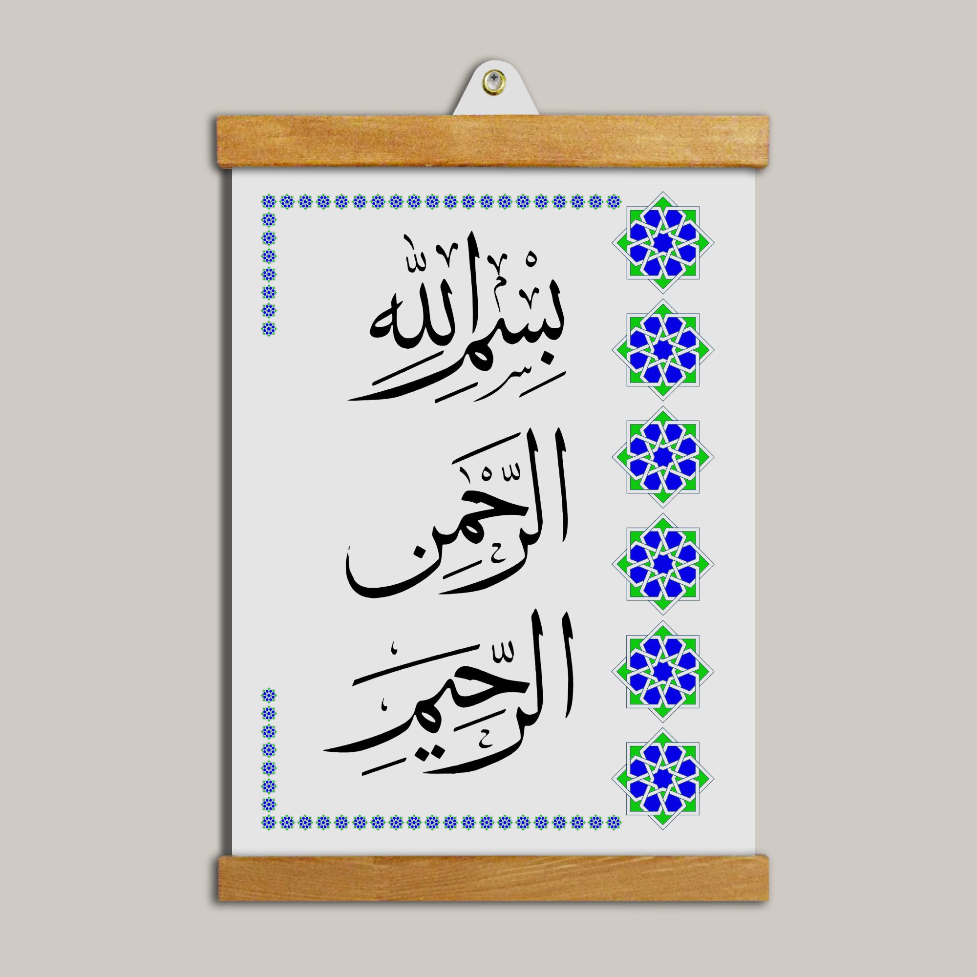 Dikey Besmele Yazılı Tablo, sade ve huzur veren tasarımıyla ev ve çalışma alanları için manevi bir dokunuş sunar.
