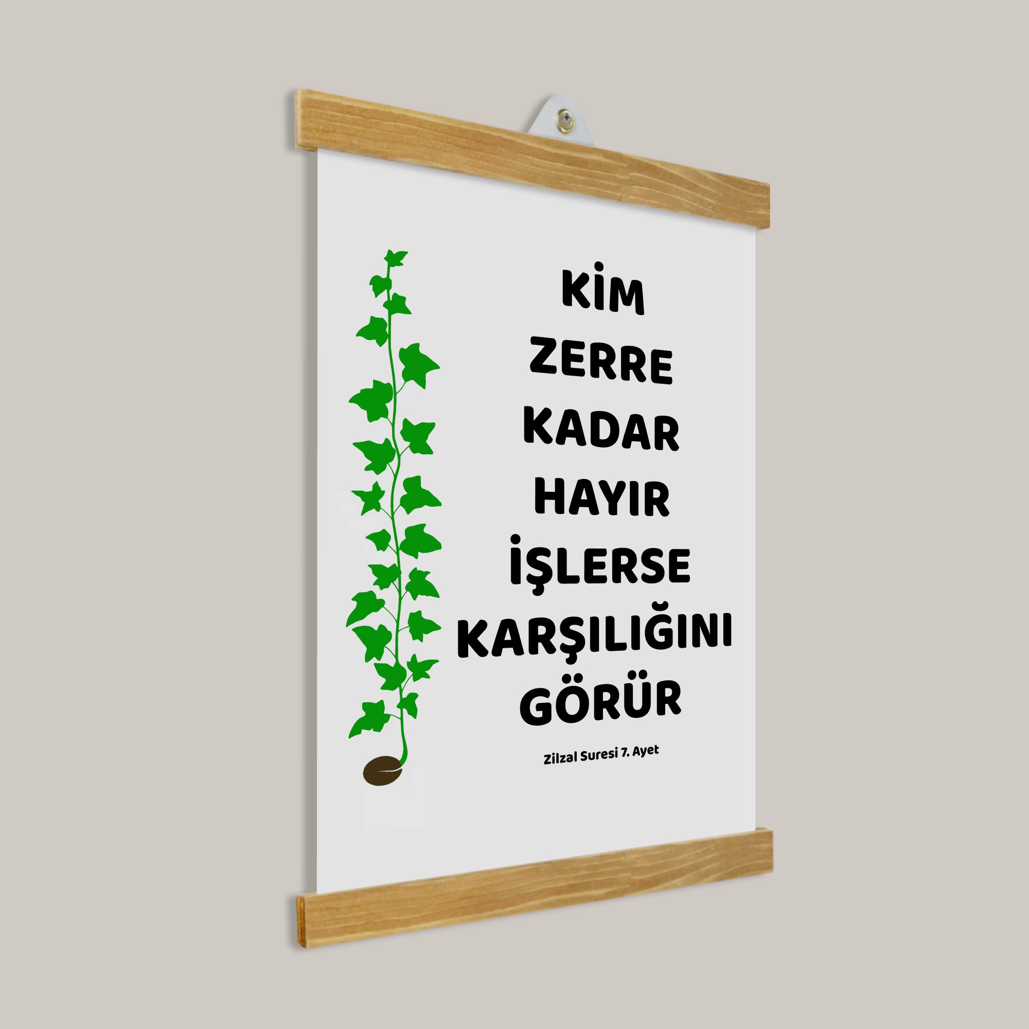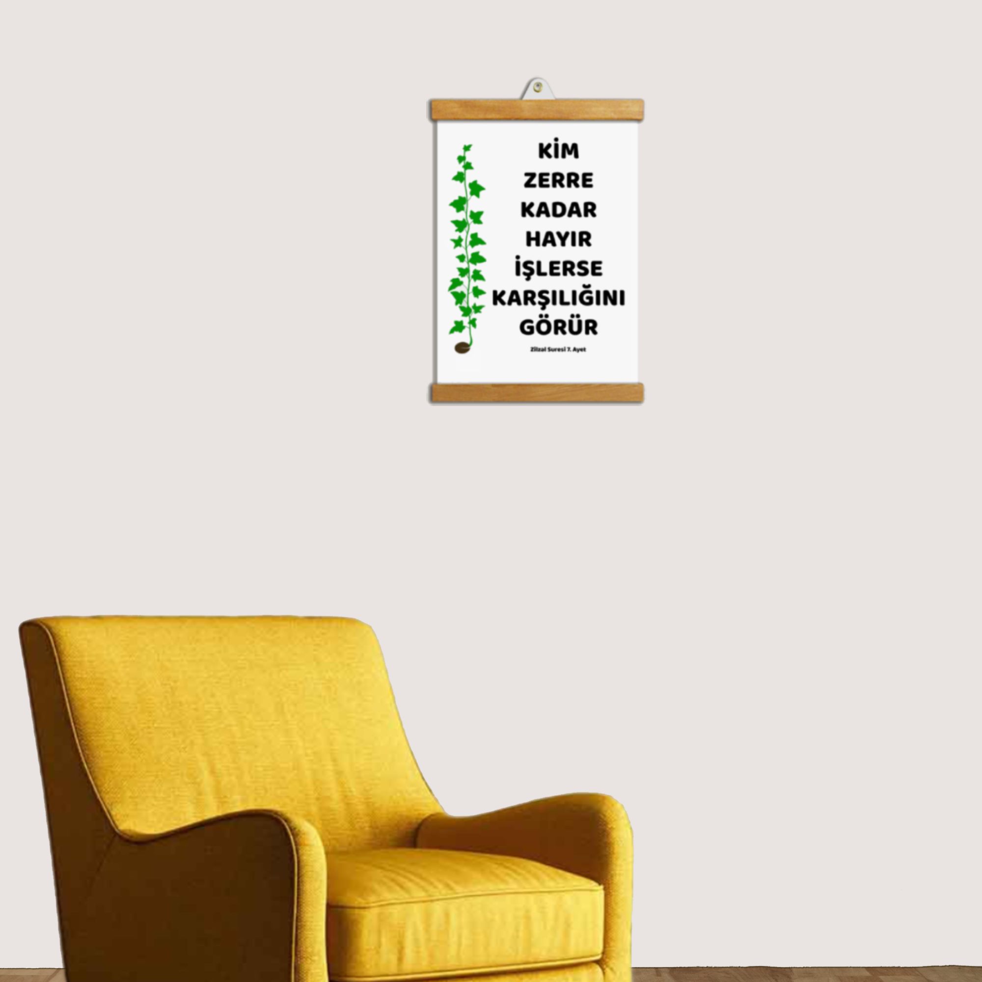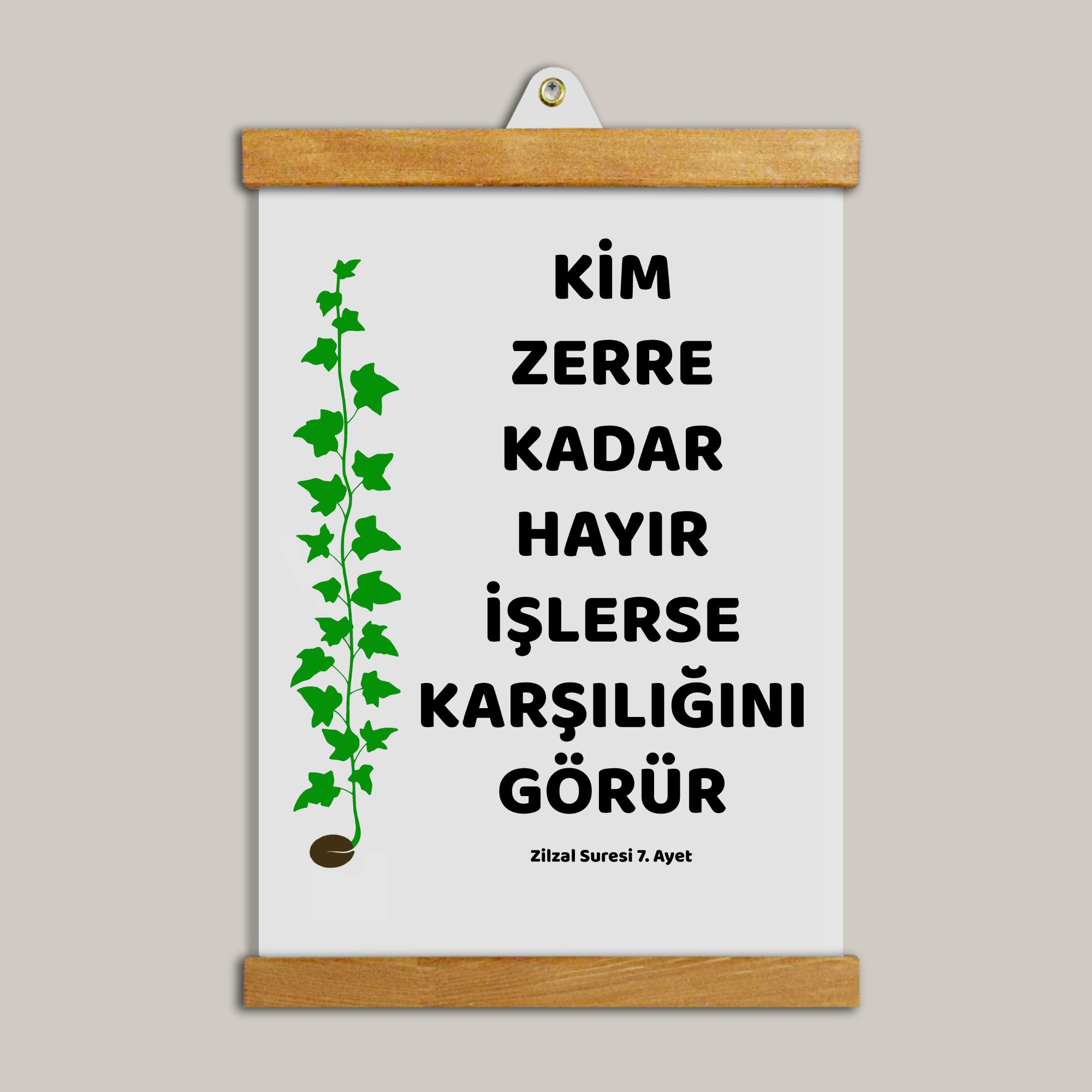 Zerre Kadar Hayır Ayeti Tablo, sade ve huzur veren tasarımıyla ev ve çalışma alanları için manevi bir dokunuş sunar.
